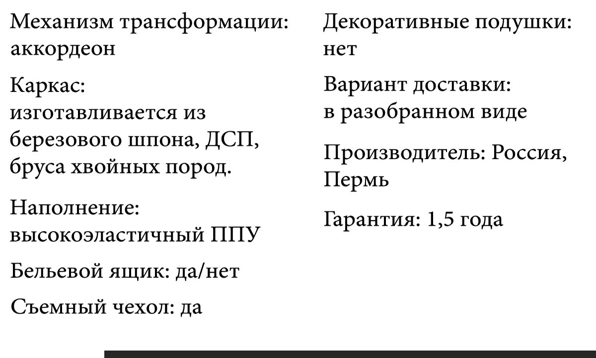 Механизм раскладки: аккордеон Механизм с повышенными эксплуатационными характеристиками – подходит для ежедневного использования. Чтобы разложить диван нужно потянуть за скрытый ремешок у основания сидения, сидение поедет вперед, разворачивая двойную спинку дивана. |