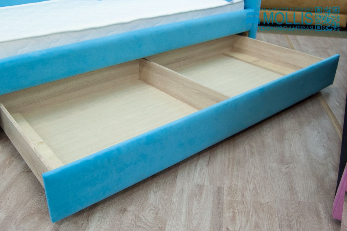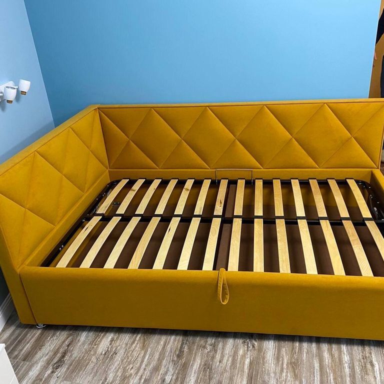 Кровать угловой формы имеет 2 мягкие спинки, выполненные в форме объемных ромбов, затянутых изнутри. Данный вариант кровати защищает ребенка от холодных стен, что немаловажно с учётом особенностей нашего климата.