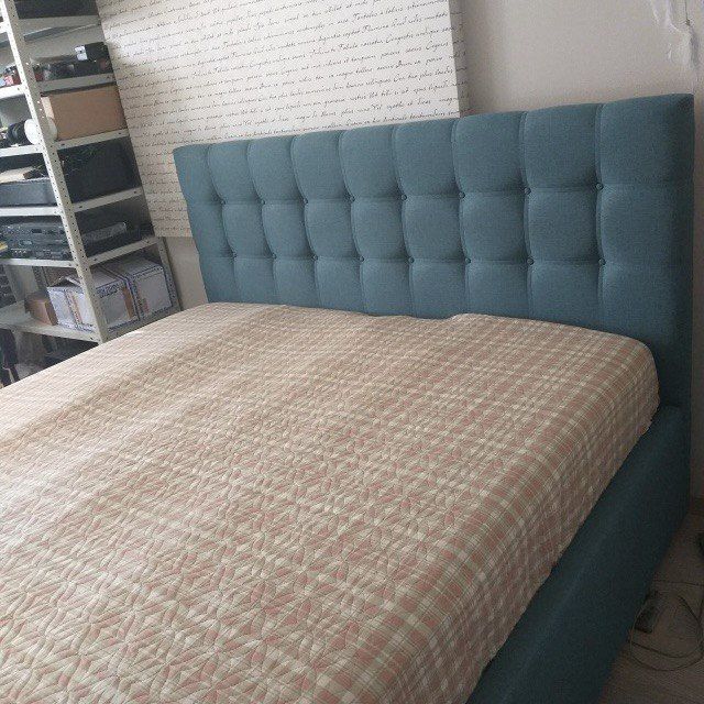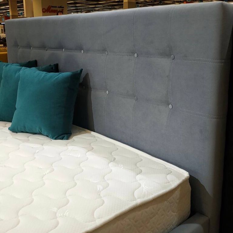 На мягком изголовье кровати выполнена утяжка в виде квадратов, украшенная двойной декоративной строчкой с декором из пуговиц в два ряда, либо страз.