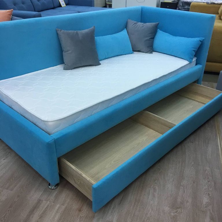 Кровать угловой формы имеет 2 мягкие спинки. Данный вариант кровати защищает ребенка от холодных стен, что немаловажно с учётом особенностей нашего климата.