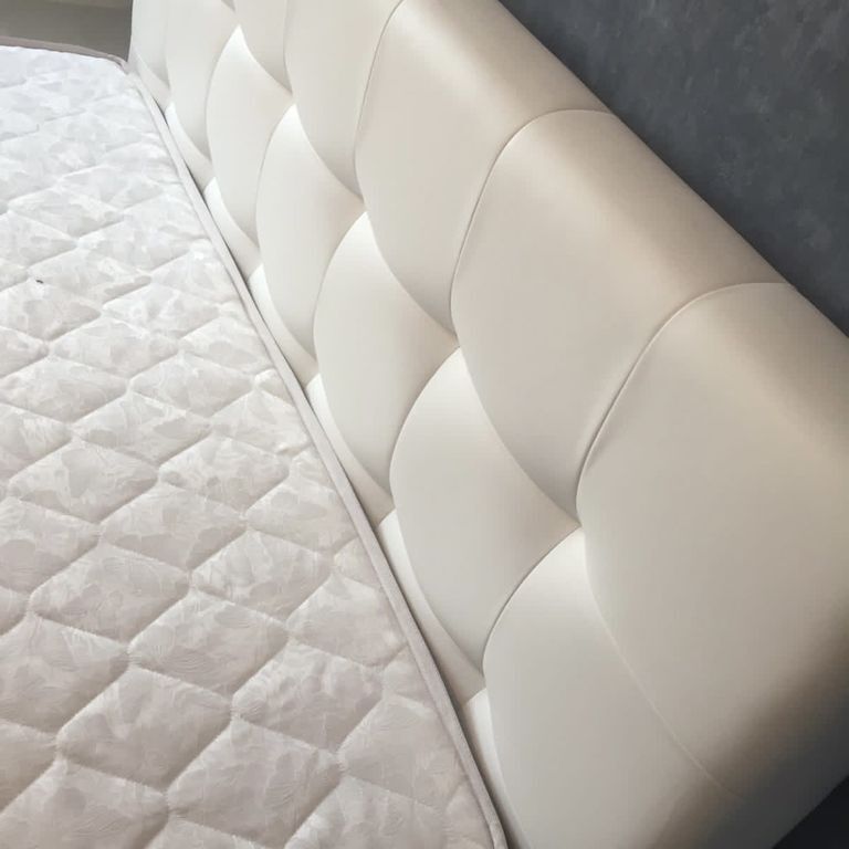 На мягком изголовье кровати выполнена утяжка в виде квадратов, украшенная двойной декоративной строчкой.