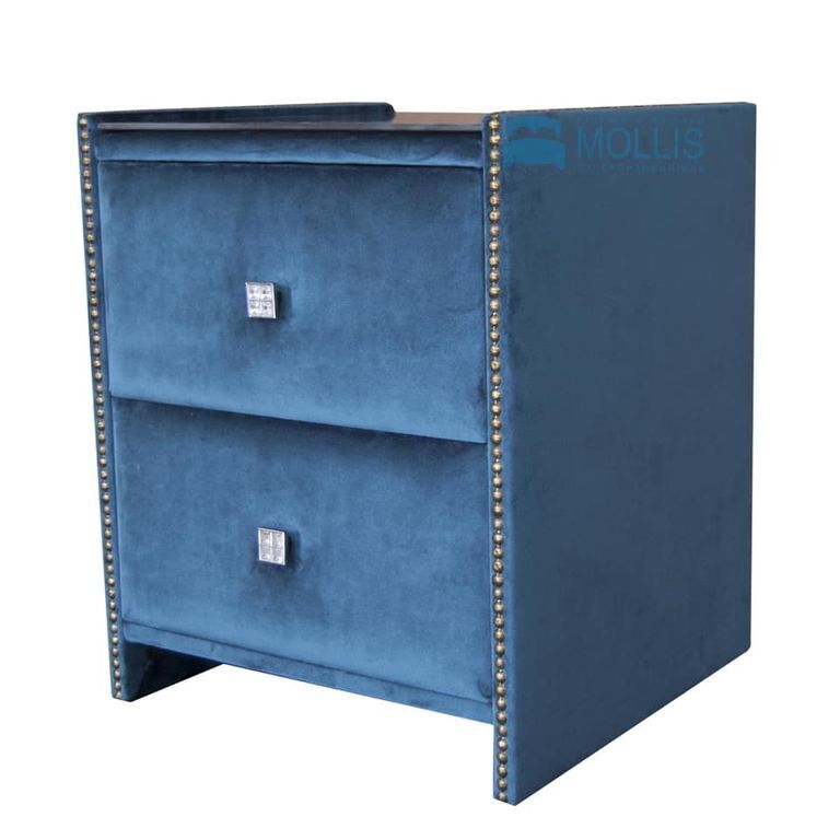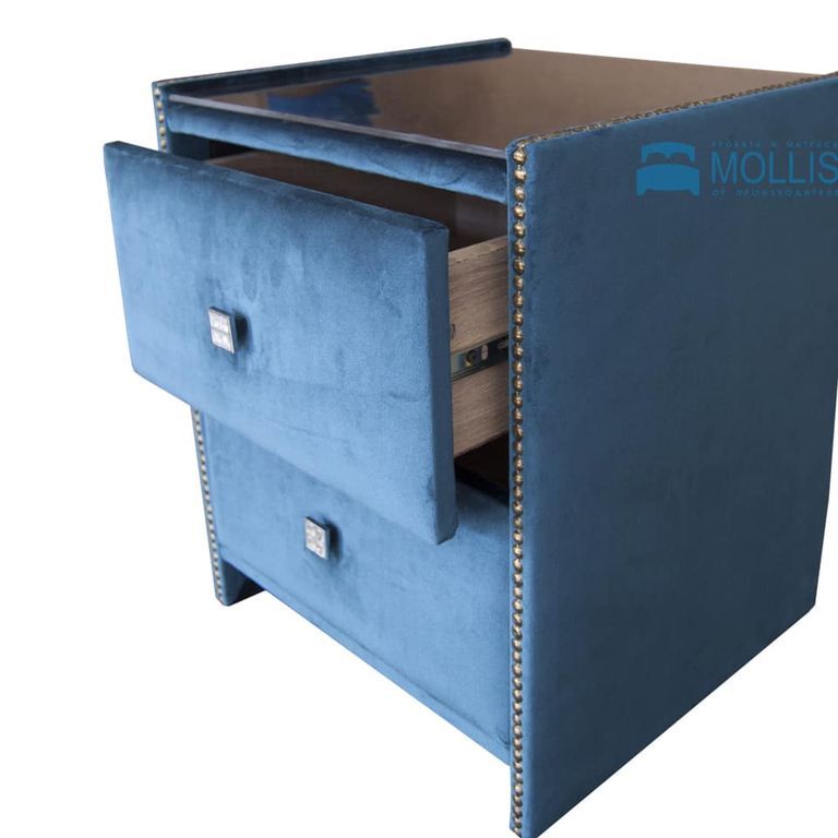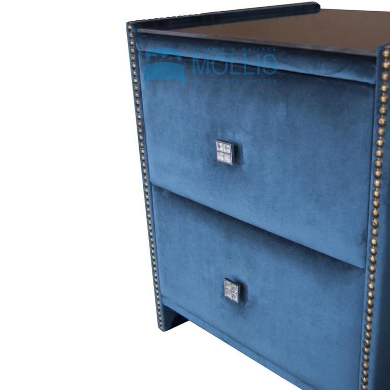 Эта модель имеет выдвижные ящики, усиленные направляющие и ручки хромированные со стразами. Возможно исполнение как в ткани, так и в эко-коже.